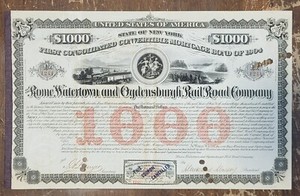 $1,000 Bond Rome Watertown and Ogdensburgh Railroad Train Locomotive Railway