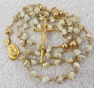 Vintage Rosary SN Japan Metal Tag Gold Enamel Painted Triangular Beads Goldtone