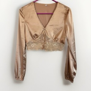 SHEIN Nude Gold Satin Crop Top Blouse Size S Shirt Lace Buttons Boho Fairy