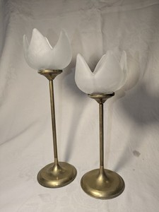 PAIR OF VINTAGE BRASS FROSTED GLASS TULIP FLOWER TEA LIGHT CANDLE HOLDERs