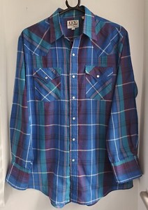 Vintage Ely Cattleman Blue Check Western Shirt Pearl Snaps 45"-114.5cm M (253WR)