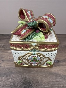 Fitz And Floyd Classics Florentine Christmas Lidded Box Trinket Holly Bow VTG