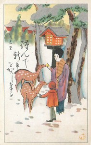 Japanese Art Postcard Woman and Child Feeding Deer in Snow, Silver Shadows