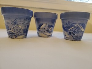 3 VTGCurrier & Ives Old Homestead In Winter/Farners Home Planter Pot Blue White