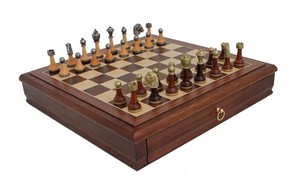 Italfama Handmade Chess Set Gold/Silver Metal Pieces, 32cm Wood Board w/ Drawer