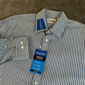 Haggar Premium Comfort Dress Shirt Slim Fit Blue White Striped Men 16-16.5 32/33