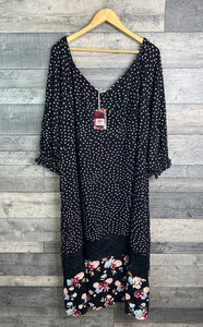 Joe Browns Maxi Dress Size UK 28 Black Polka Dot Floral Lace Insert 3/4 Sleeves