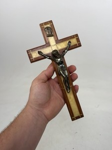 Mid Century MCM Metal Jesus Christ Art Crucifix Religious Wooden Cross Altar 8”