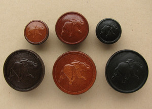6 Vintage Leather Picture Buttons Elephant Running Trunk Up Browns Black Fun!