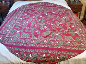 April Cornell Round Christmas Pattern Tablecloth. 64 Diameter Birds Acorns Red