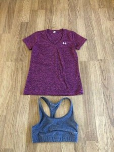 LOT ~ UNDER ARMOUR V neck Pink Heather T-shirt & Gray Sports Bra (Small)