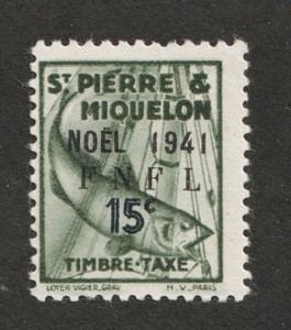 1942 St-Pierre et Miquelon Sc# J50 (15 ¢ postage due). Cod Fish. MH Cv$24.00