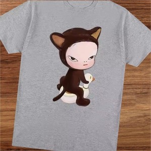 Yoshitomo Nara Style Black Cat Graphic Stretch T-Shirt Gray XL Japan Art Rare