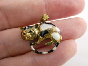 Vintage Chinese Export Gilt Sterling Silver Black and White Enameled Cat Pendant