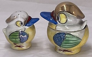 1940s Kookaburra Birds Sugar Bowl w/Lid & Shaker Lusterware Hand Painted Japan