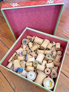 HUGE LOT Vintage Wooden Sewing Spools ~ EMPTY - No Thread - Labels w/ BONUS BOX