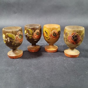 Vintage Wood Egg Cup Set Hand Turned Rosemaling Norwegian Lot or 4
