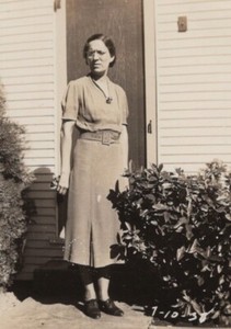 1939 Woman Standing Porch Stylish Dress Bushes Home Background Confident Pose