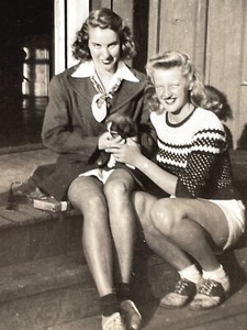 J8 Photograph 1940s Two Beautiful Women 2 Pretty Holding Puppy Bobby Socks
