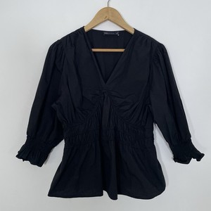 M&S Collection Top Blouse Black Shirred Fitted VNeck Cotton Poplin Sz 16 Elastic