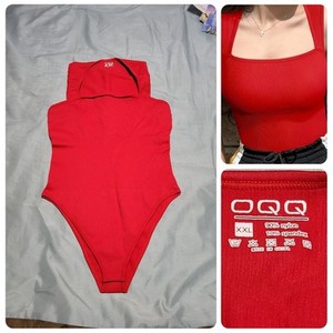 OQQ Red Ribbed Bodysuit Tummy Control, Square Neck, Stretch Nylon Size XXL, NWOT