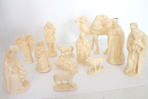 Vintage Christmas Nativity 12 Piece Set Cream / Ivory Hard Plastic W/ Camel