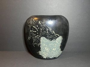Vintage 1989 OOAK Signed Black & Grey Etched Pottery Art Ceramic Cat Vase 8.5"