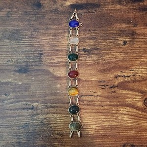 Vintage Scarab Bracelet Double Link Gold Tone Gemstone Egyptian Revival