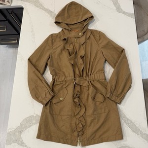 Tory Burch Warren Ruffle Belted Hooded Trench Coat Women’s 10 Camel Brown/Gold