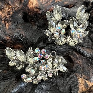 Vintage Smokey Gray AB Set Rhinestone Clip Earrings + Brooch Wedding Hair Party
