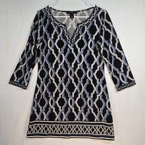 White House Black Market Geo Print Shift Dress 3/4 slv Black Blue White Small