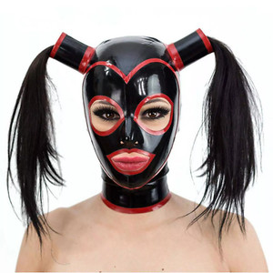 Latex Gummi Hood Rubber Mask w/ Black double wig Pigtails Fetish BDSM Cosplay