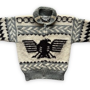 Mens Vintage Cowichan Wool Mix Cardigan Zipper Jacket Chunky Knit Cream Eagle