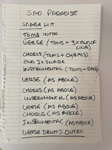 BLACK DOLDRUMS ORIGINAL HANDWRITTEN SAD PARADISE DRUM NOTES RECORDING SESSION
