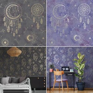 Holden Dreamcatcher Metallic Wallpaper Nightsky Moon Stars - Black | Purple