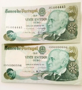 Lot of 2 Portugal 20 Escudos Banknotes 1978 - Gago Coutinho 1978