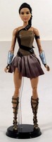 Beautiful and articulated warrior Wonder Woman Paradise Island doll. She has a fantastic face sculpt that looks like the actress Gal Gadot. She wears a costume from Paradise Island in the movie. She has double-jointed elbows and knees, and an athletic sculpt. Her feet are molded and not articulated. She wears braided hair.