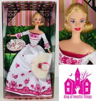 Darling Victorian Tea Barbie. Her dress is stunning and she comes with a lovely hat. I like the tea set which matches color and design of her dress. The backdrop adds to the ambience of the doll. She has blonde rooted hair, blue eyes and her makeup matches her dress details as well. She has six points of articulation, at the head, shoulders, legs and waist, with click-bending knees. A wonderful addition to your collection.