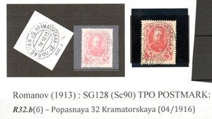 RUSSIA: 1 x ROMANOV (1913) TPO - SUPERB POSTMARK for Popasnaya 32 Kramatorskaya