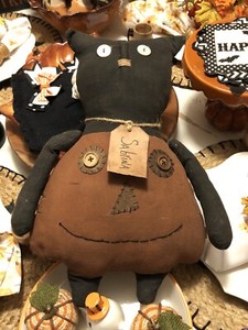 15" Black Halloween Cat Muslin Jack-O-Lantern Button Primitive Grungy Plush